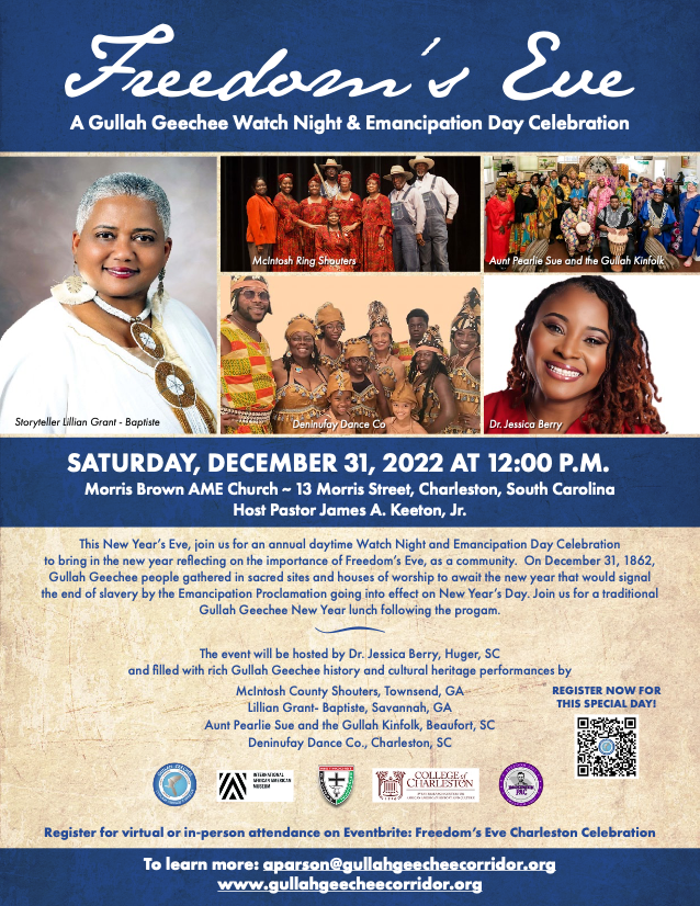 The Freedom’s Eve Charleston Celebration took place at Morris Brown AME Church, hosted by Dr. Jessica Berry, and featured performances by the McIntosh County Shouters of Townsend, GA, Aunt Pearlie Sue and the Gullah Kinfolk of Beaufort, SC, Deninufay Dance Co. of Charleston, SC, Master Storyteller Lillian Grant-Baptiste of Savannah, GA, and more!