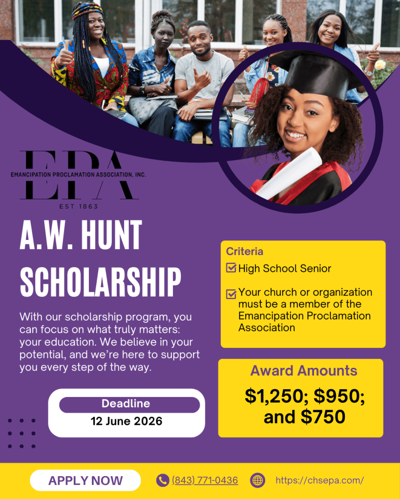 Please mail the application to Dr. Blondell Kidd, C/O Emancipation Proclamation Association | P. O. Box 40095 | North Charleston, SC 29423.